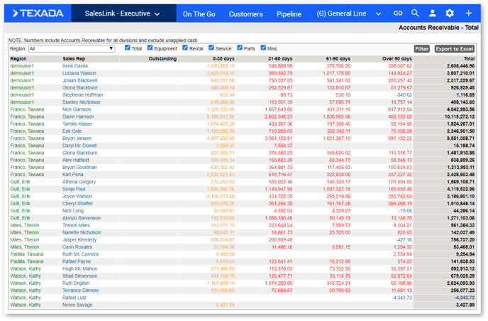 This page displays detailed accounts receivable information for all of your customers, organized by region and sales rep.