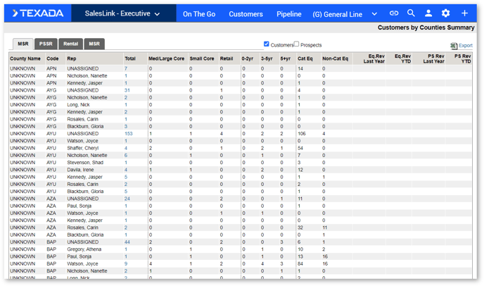 This page displays a table of current customer revenue details organized by county. Use the tabs at the top left of the page to switch between MSR, PSSR, Rental, and Other.