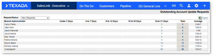 This page displays all your outstanding account update requests, organized by Branch Administrator. Filter the table using the Request Status drop-down menu at the top left of the page.