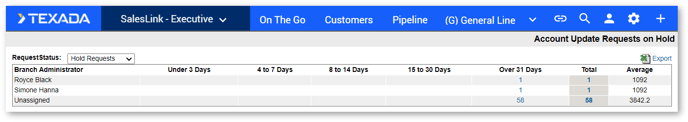 This page displays a table of account update requests that are currently on hold, organized by Branch Administrator. Click on a number in the table to view details regarding those requests.