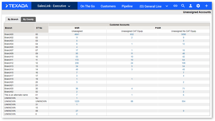 Click on the tabs at the top of the display unassigned accounts by Branch or by County.