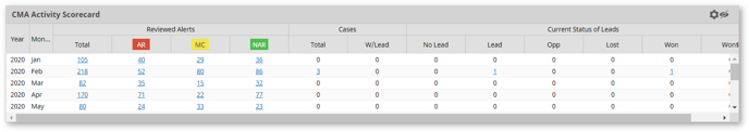 The CMA Activity Scorecard table combines the first two charts (Alerts Reviewed and Cases) into one table, along with more detailed information on the status of the leads in the cases.