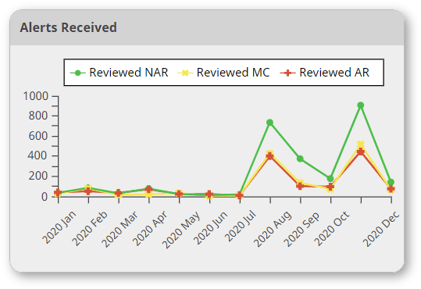 The Alerts Received chart displays the number of alerts of each type that were reviewed each month, for the selected time range.