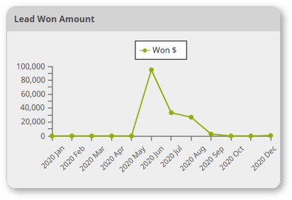 The Lead Won Amount chart displays the dollar amount of the lead won each month, for the selected time range.