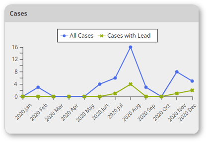 The Cases chart displays the number of total Cases, as well as just the Cases with Leads, handled each month, for the selected time range.