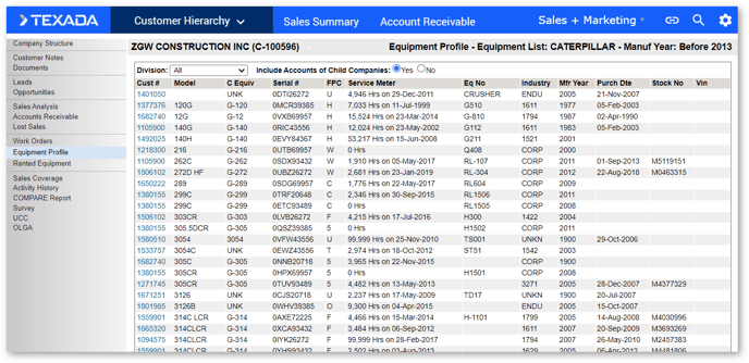 View the revenue details for all of the companies that are set up in Customer Hierarchy with the Sales Summary page. This page displays a five-year historical view for Equipment and rentals as well as Parts and Service. This allows you to easily view trends. To see a company’s details, click on the desired Company Number.