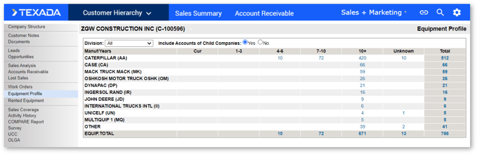 Each Company will have a view of their complete equipment list with all the details on each serial number. This view starts out with an aged view of equipment units categorized by the manufacturer. Each of these numbers represents the number of units in that category. Click into the numbers for more detailed information.