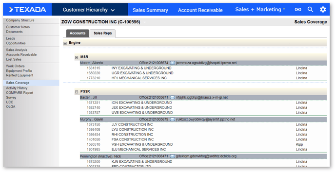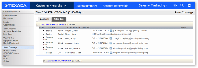 This view of the Company’s sales coverage model provides sales managers and executives with visibility into how the account is being managed. View by accounts to see the individual DBS accounts and the Sales Reps that are assigned to them, organized by division. Click into the Sales Reps tab to view the same data organized by Sales Rep.