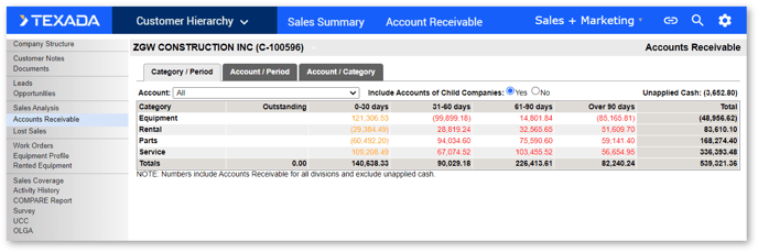 View accounts receivable information by company and filter by equipment, rentals, parts, service, and miscellaneous by clicking their respective buttons. The numbers include Accounts Receivable for all divisions and exclude unapplied cash.