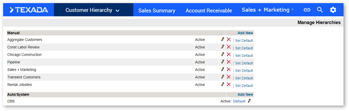 In the Admin menu, click Manage Hierarchies to add and edit the company groupings in the Customer Hierarchy drop-down at the top of the application. Click the pencil icon next to a hierarchy to set the Hierarchy as Active or Disabled, or set that Hierarchy as the default.