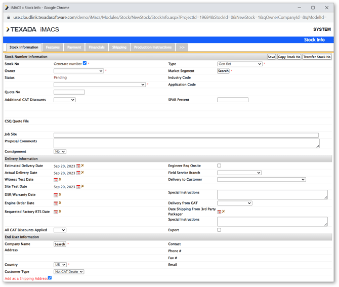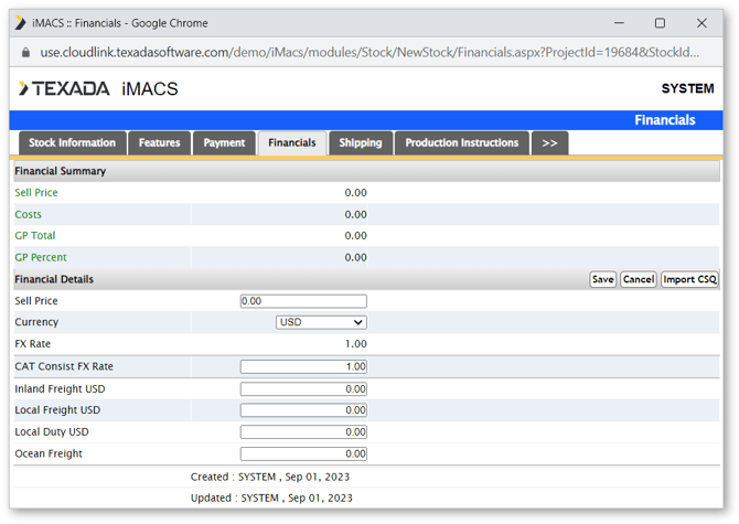 The financial information can be manually entered, or imported from Power Systems Quoter (this function is only available for Power Systems stock numbers).