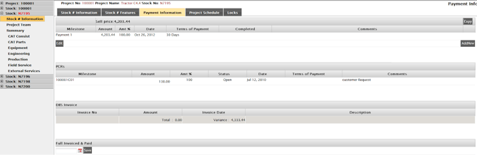 On the Payment Information tab, click Add New to create payment milestones for the stock number. Milestones can be entered as an amount or a percentage (for example, a percentage due at order acceptance, another due on delivery, and a final amount due at start-up). If you use Copy to bring payment milestone details from another stock number, note that copying replaces the current payment milestone information on the page.