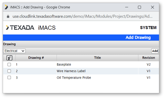 To list the drawings that were sent with the transmittal, click the Add button under the transmittal header. The list of electrical drawings is shown in the pop-up window. To view the mechanical drawings, choose Mechanical from the drop-down box in the top left corner. Click the Add button next to the drawing you want to add to the transmittal.