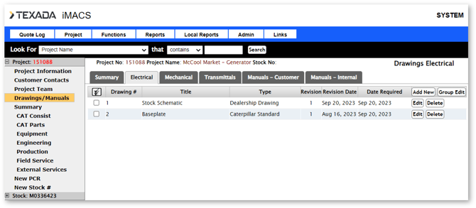 There are 2 tabs for Manuals - one for manuals sent to the customer, the other for manuals used internally. To edit the Date Issued and Comments, click the Edit button. To list the drawings that are included in the manual, click Add New. The list of electrical drawings is shown in the pop-up window. To view the mechanical drawings, choose Mechanical from the drop-down box in the top left corner. Click the Add button next to the drawing you want to add to the manual.
