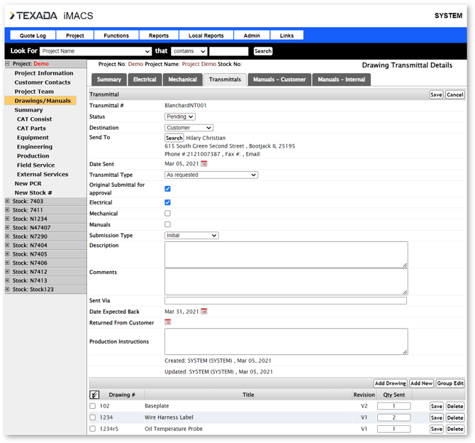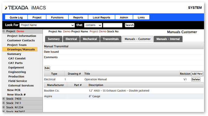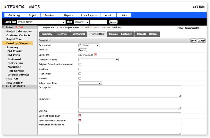 iMACS has robust document management functionality that allows the project team to log and to track drawings and manuals for both the customer and internally. The actual documents can be accessed in Project Information → Project Files.