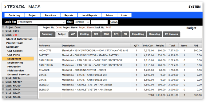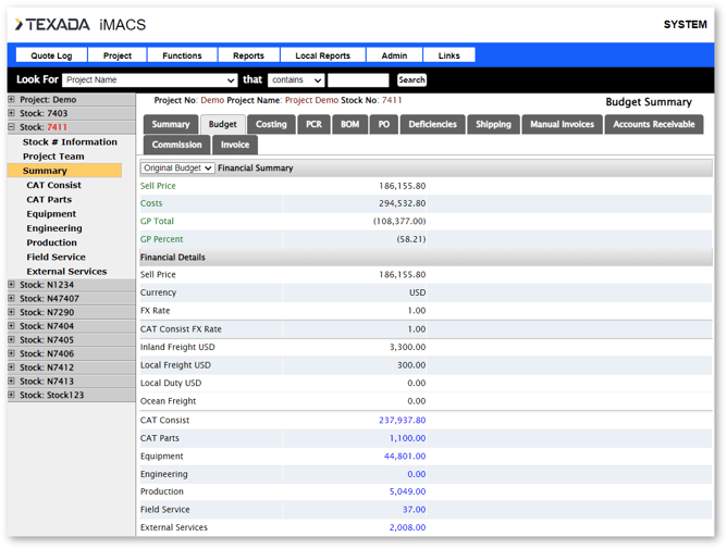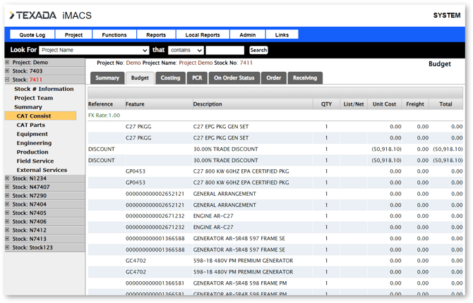 Each class in a stock number has its own budget. The budget line items can be manually entered, or imported from Power Systems Quoter (this function is only available for Power Systems stock numbers).