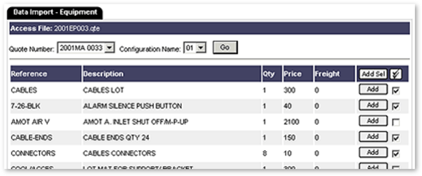 The screen will now show the quote number and the configuration name. Choose a configuration name, and click Go. The data from the quote file will be displayed. Click on the Add or Add Sel button.
