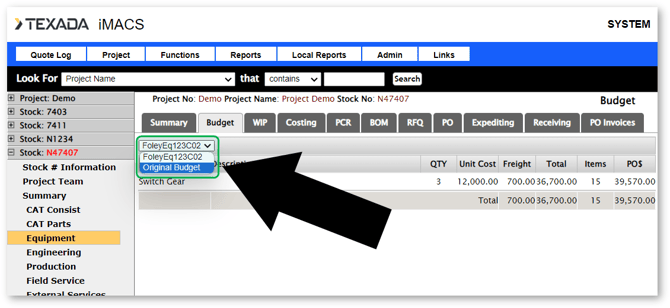The drop down box in the top left corner shows the budget revisions. If Project Change Requests have been issued, the box will show the PCR numbers. You can view previous revisions of the budget by choosing Original Budget, or a Project Change Request number. If you are viewing any revision after the original budget, a Change field will be shown indicating which lines items were changed, and what type of change it was.