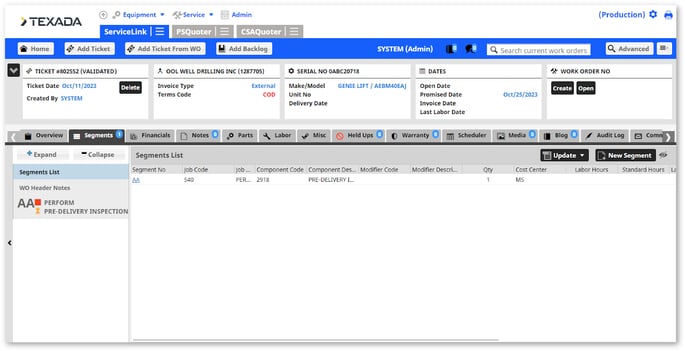 Once SVL Ticket Inspect Segment Enabled is set to “Yes” and the remaining keys have been configured to your liking, all new Tickets created in Texada ServiceLink or the Equipment Monitoring Toolkit will be created with an initial segment with the specified properties.