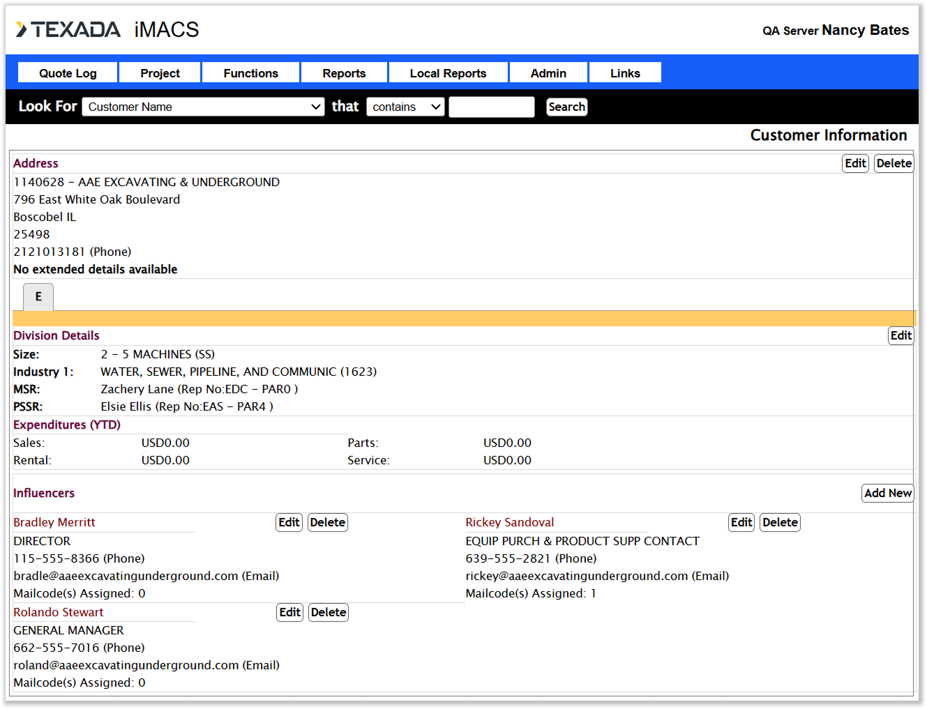 Clicking on the blue Customer Number link will take you to the Customer Information page. From this page, you can edit or delete the customer, edit the division details and add/edit an influencer. All the DBS customer information is downloaded nightly and any edits will be sent to the SalesLink gatekeeper as a Request. If the customer is a Prospect, all changes will occur immediately.