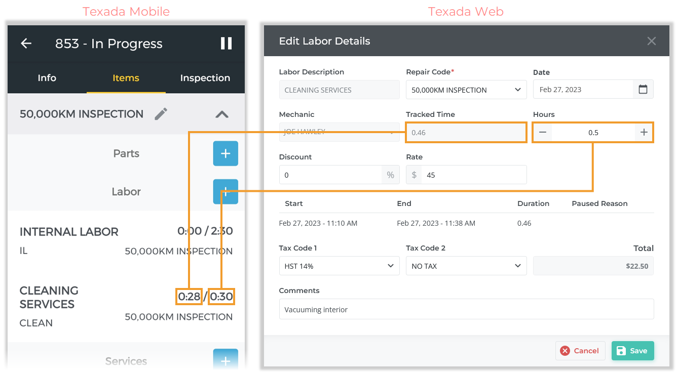 The Tracked Time and Labor Hours values are presented side-to-side both in Texada Mobile and Texada Web. The below image illustrates the locations of these fields in both programs.