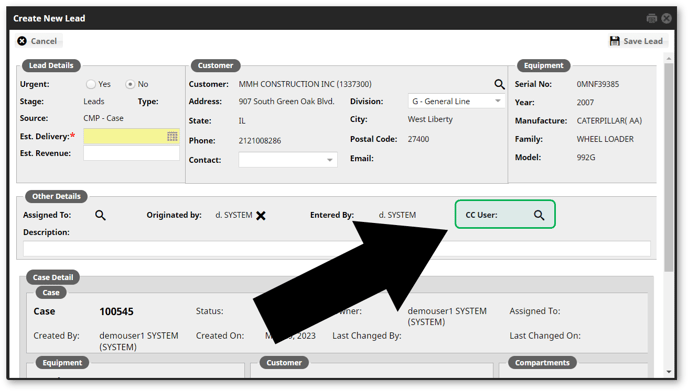 To add a CC User to a lead, click the magnifying glass