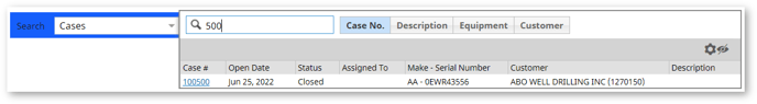 Use the Search menu and text field to search by keyword within Cases, SOS Results, Electronic Data, Service Letters, or Inspections. Choose an area to search within after typing your search term(s). The areas that display depend on the selection made in the menu.