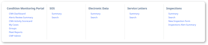 to the right of the Condition Monitoring tab to access areas within the Condition Monitoring application: Condition Monitoring Portal, SOS, Electronic Data, Service Letters, and Inspections.