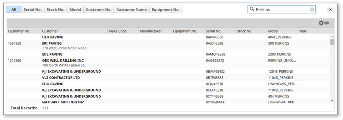 (next to the Gear icon) to toggle column visibility on and off. - Click on equipment serial numbers to view detailed information on that piece of equipment. See the EquipmentLink section for more information.