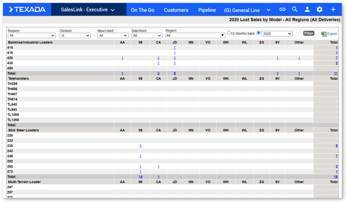 This page displays a detailed table of all lost sales, organized by equipment model. Use the drop-down menus at the top of the page to filter the table. The table will automatically update as each filter selection is made.