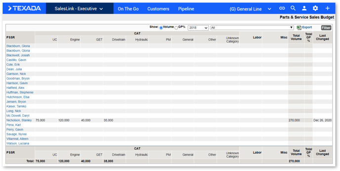 Click the Parts & Service Sales Budget link under PIPELINE in the top navigation bar. The Parts & Service Sales Budget page displays.