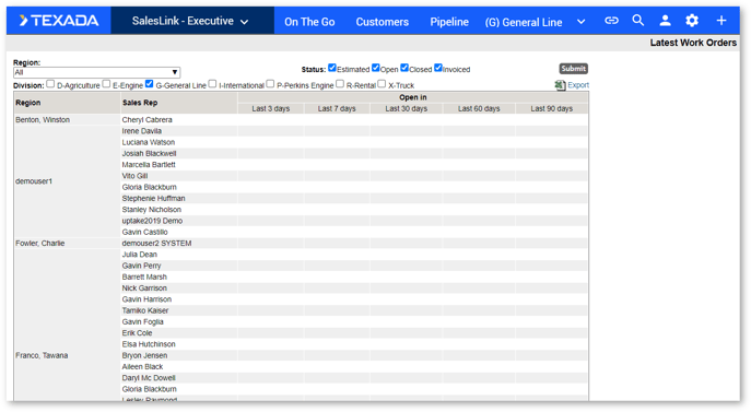 Click on a number in the table to view details regarding that sales rep’s work orders.