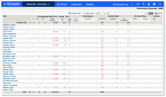 Click the Sales Performance Summary link under PIPELINE in the top navigation bar. The Performance Summary – MSR page displays.