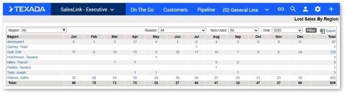 Click the Lost Sales by Region link under PIPELINE in the top navigation bar. The Lost Sales by Region page displays.