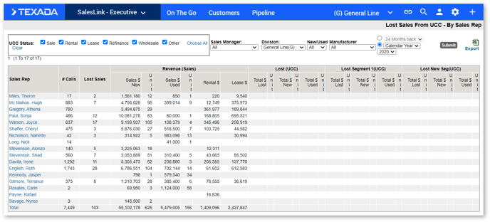Click the Lost Sales From UCC link under PIPELINE in the top navigation bar. The Lost Sales From UCC – By Sales Rep page displays.