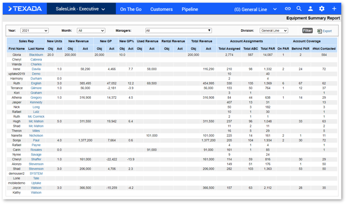 Click the Equipment Sales Budget link under PIPELINE in the top navigation bar. The Equipment Summary Report page displays.