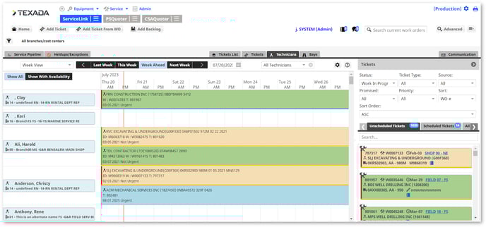 This page displays the same basic information as the Tickets page, but is organized by individual technicians. Use the buttons above the schedule to view different weeks or months, or use the drop-down menu to change how many days are displayed at once.
