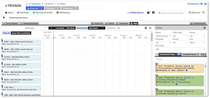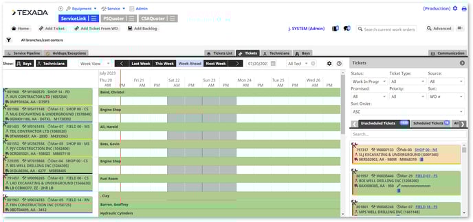 This page displays the same basic information as the Tickets page, but is organized by individual bays. Use the buttons above the schedule to view different weeks or months, or use the drop-down menu to change how many days are displayed at once.